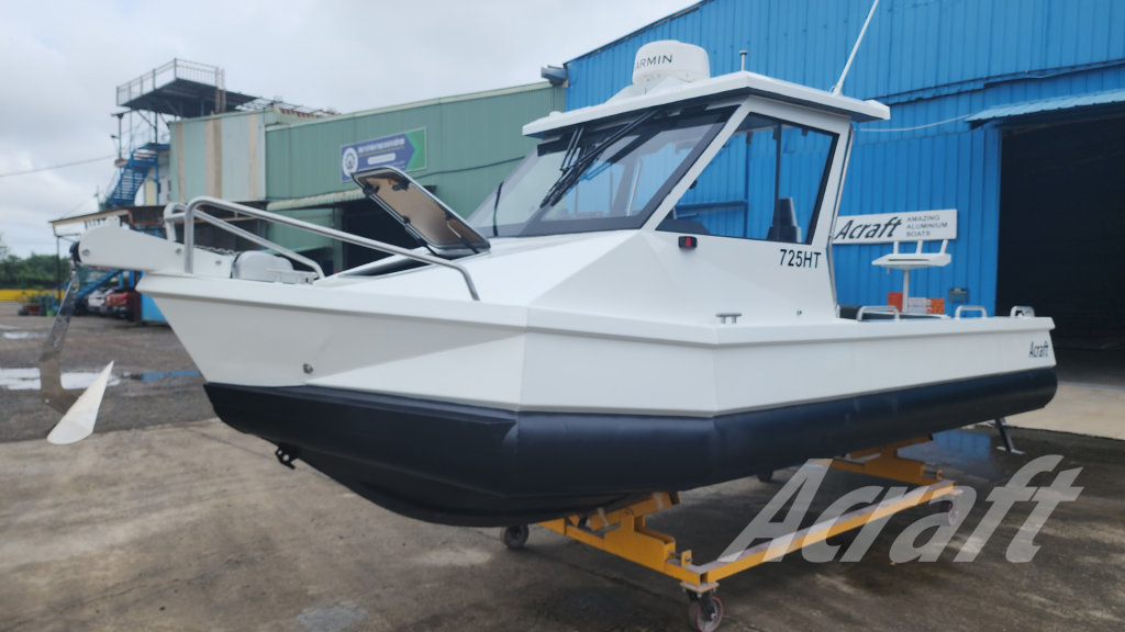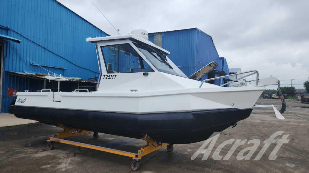 The 725 SFHT is a 7.25m trailable boat with a deep vee to cut through the waves but large pontoons to provide stability. All of the deep vee boats have performance lifting stakes and spay deflecting chines that help to reduce drag by providing lift and reducing the wetted area of the hull. This gives the perfect balance of performance, handling and fuel economy.